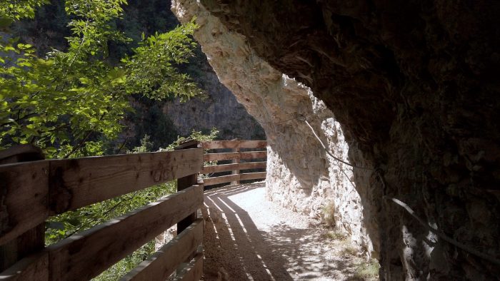 Il percorso segue un vecchio canale ottocentesco scavato nella roccia a filo della parete esterna, che portava l’acqua dal Rio Romedio alle campagne di Sanzeno. A proteggere dal canyon sottostante, c’è una massiccia ringhiera di legno, che smorza un po’ la vista dell’altezza ma che, per chi ha paura, potrebbe non bastare.
