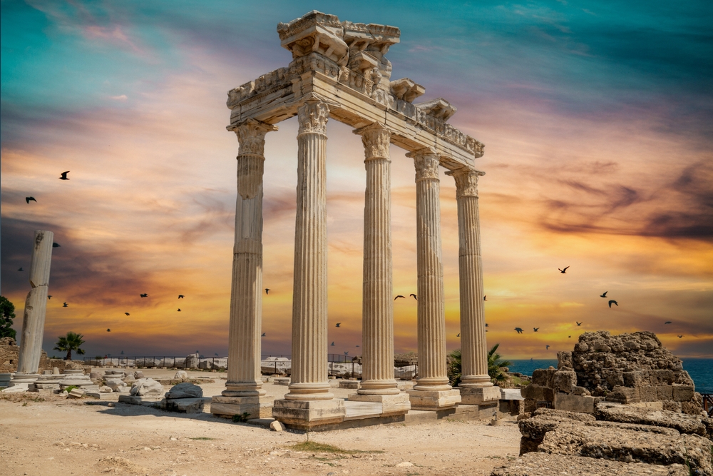 Tempio di Apollo, Side (Turchia). La città di Side, sulla costa mediterranea della Turchia meridionale, è una destinazione perfetta per chi vuole combinare mare e cultura durante le proprie vacanze. Qui le meravigliose spiagge della Riviera Turca si accostano perfettamente alle rovine dell’antica città di Side. Ne è un esempio lo spettacolare Tempio di Apollo, costruito nel II secolo a.C. in onore del dio della musica, dell’armonia e della luce. Anche se vale la pena visitarlo in qualsiasi momento della giornata, l’esperienza è particolarmente bella al tramonto.