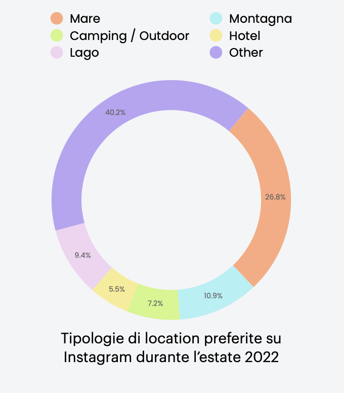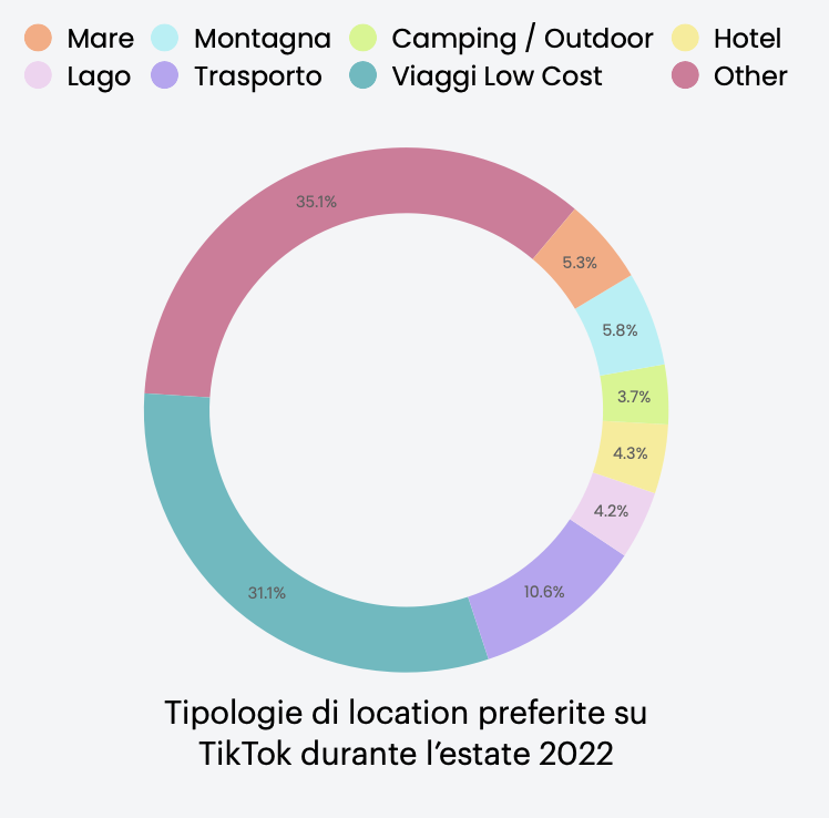 Analizzando l’uso di parole chiave e il numero complessivo di post su Instagram il mare conquista il primo posto (26,8%), seguito dalla montagna (10,9%) e dal camping outdoor (7,2%). Su TikTok, invece, le destinazioni low-cost sono quelle più pubblicate (31,1%), mentre mare e montagna si ritrovano pressoché a pari merito, con, rispettivamente il 5,3% e il 5,8%.