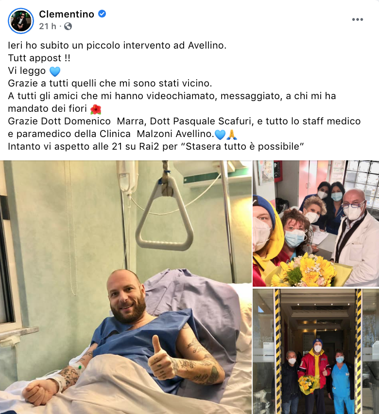 Clementino è stato costretto ad un piccolo stop in ospedale a causa di una operazione che ha subito e che ha avuto esito positivo: il rapper sta bene e infatti, non appena si è ripreso dall’intervento, ha voluto rassicurare i fan sui suoi canali social.