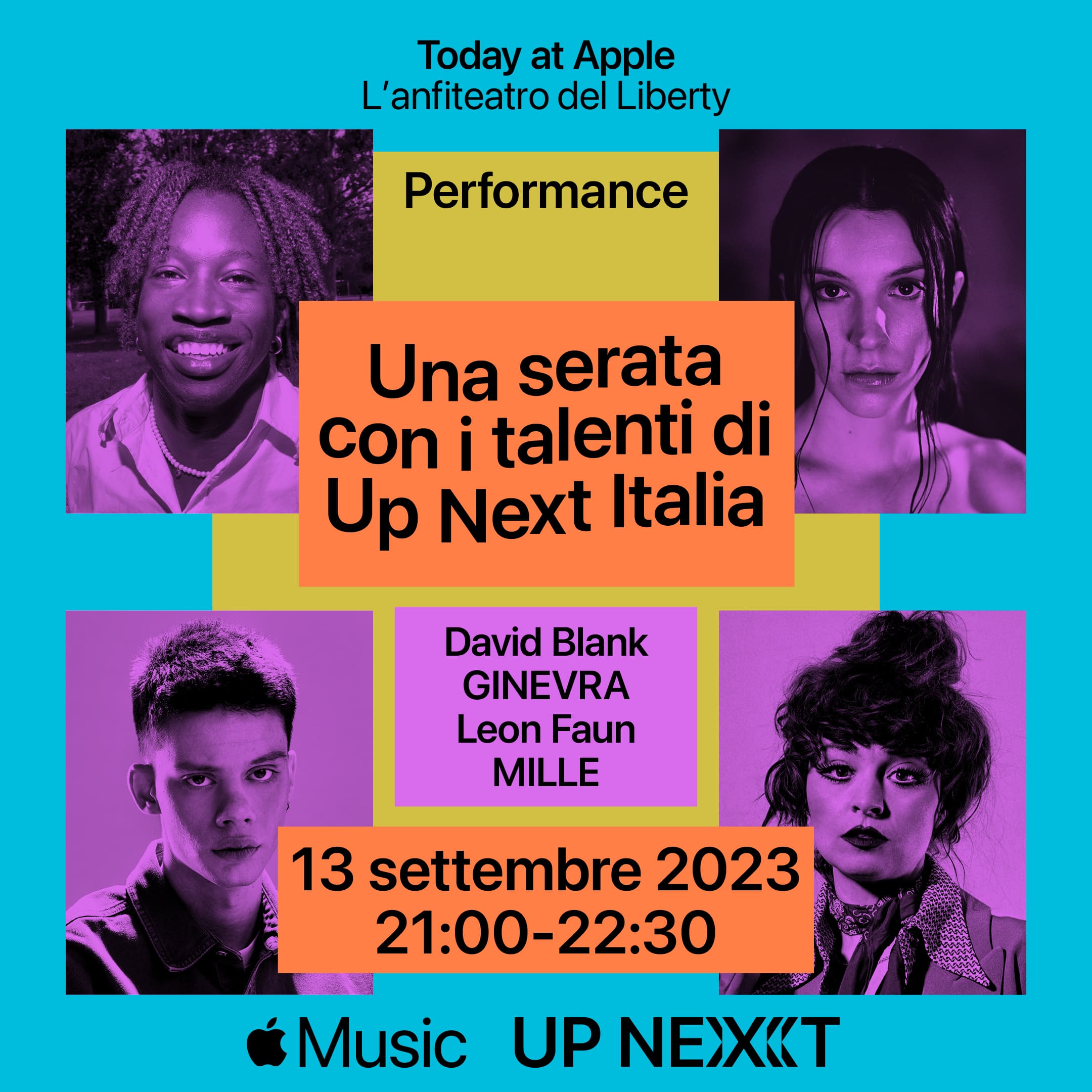 Mercoledì 13 settembre dalle 21, David Blank, GINEVRA, Leon Faun e MILLE – tra le voci selezionate nel programma Up Next Italia di Apple Music – animeranno l’anfiteatro di Apple Piazza Liberty a Milano con i loro live set. Sarà l’editor e podcaster Filippo Ferrari a presentare i talenti dello show, che si esibiranno dal vivo raccontando la propria musica e condividendola nel contesto raccolto di Piazza Liberty, che ha già ospitato in passato i live di grandi star Italiane e internazionali, come Marco Mengoni e Bad Bunny.
