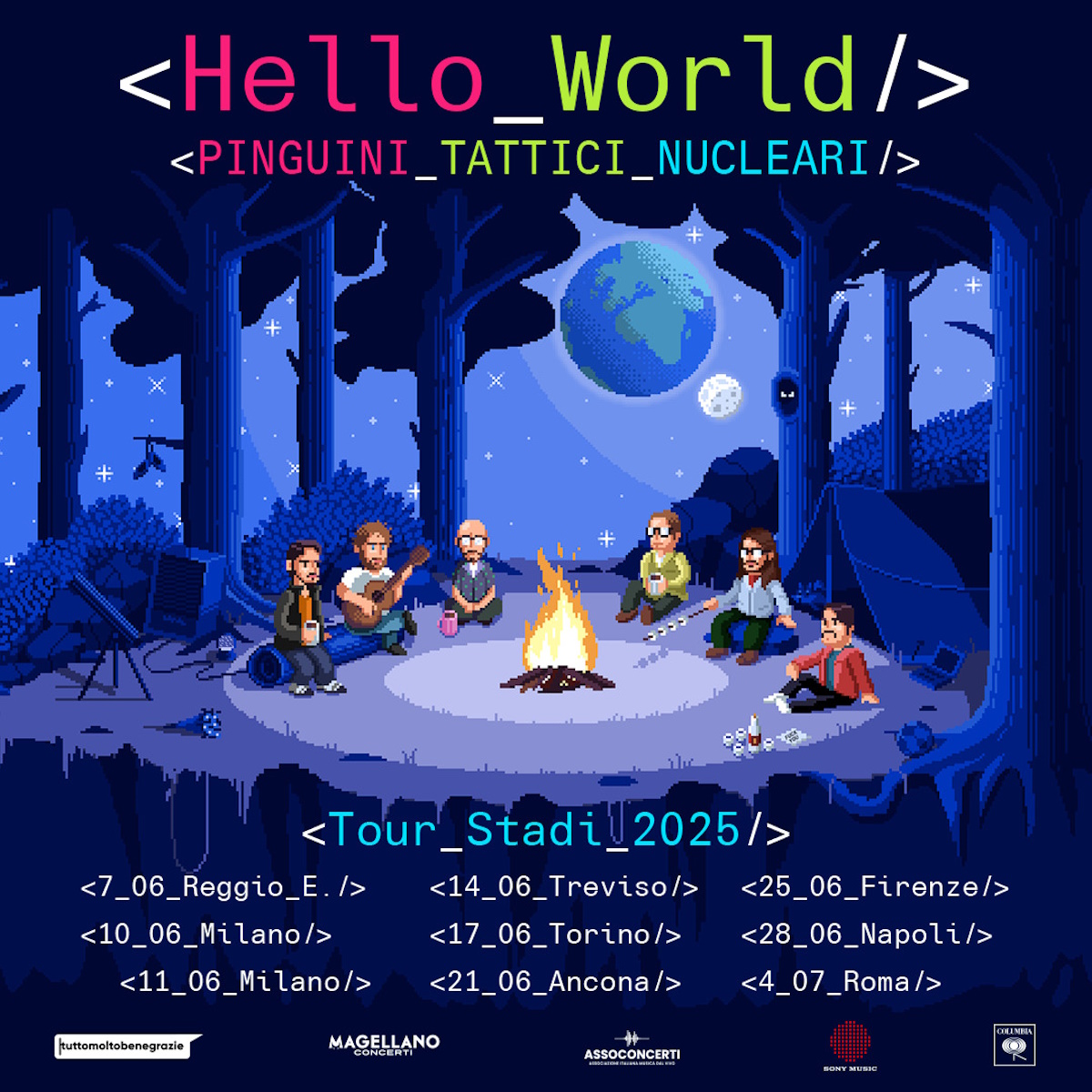 Alla vigilia del tour nei palasport con 33 concerti sold out dal 3 aprile al 19 maggio 2024, i Pinguini Tattici Nucleari annunciano il ritorno negli stadi. La band, infatti, sarà nuovamente sui palchi nel corso dell’estate 2025 con Hello World Tour Stadi 2025, al via da Reggio Emilia. Nove le prime date annunciate, dopo l’incredibile debutto che ha reso il 2023 l’anno d’oro della band. Non solo, infatti, i PTN hanno dominato le classifiche ma hanno anche incassato oltre un milione di biglietti venduti.