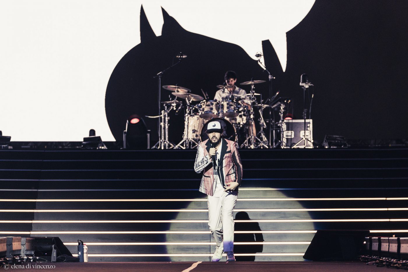 “Dall’altra – prosegue – invece puoi pensare che non è sopra la tradizione, non è un peso che ti schiaccia, ma è un macigno che sta sotto. Noi semplicemente cerchiamo di entrare in questo tempio non tanto da statue che devono essere venerate come possono essere questi altri artisti, ma da visitatori. Vogliamo capire cosa significhi suonare in uno stadio. È andata bene, nel senso che il pubblico ha risposto estremamente bene e noi ci stiamo divertendo tantissimo. Venezia lo conferma e di conseguenza, con umiltà e in punta di piedi, ma anche con la punta della cassa, entriamo a San Siro e potrete aspettarvi, secondo me, uno show denso”.