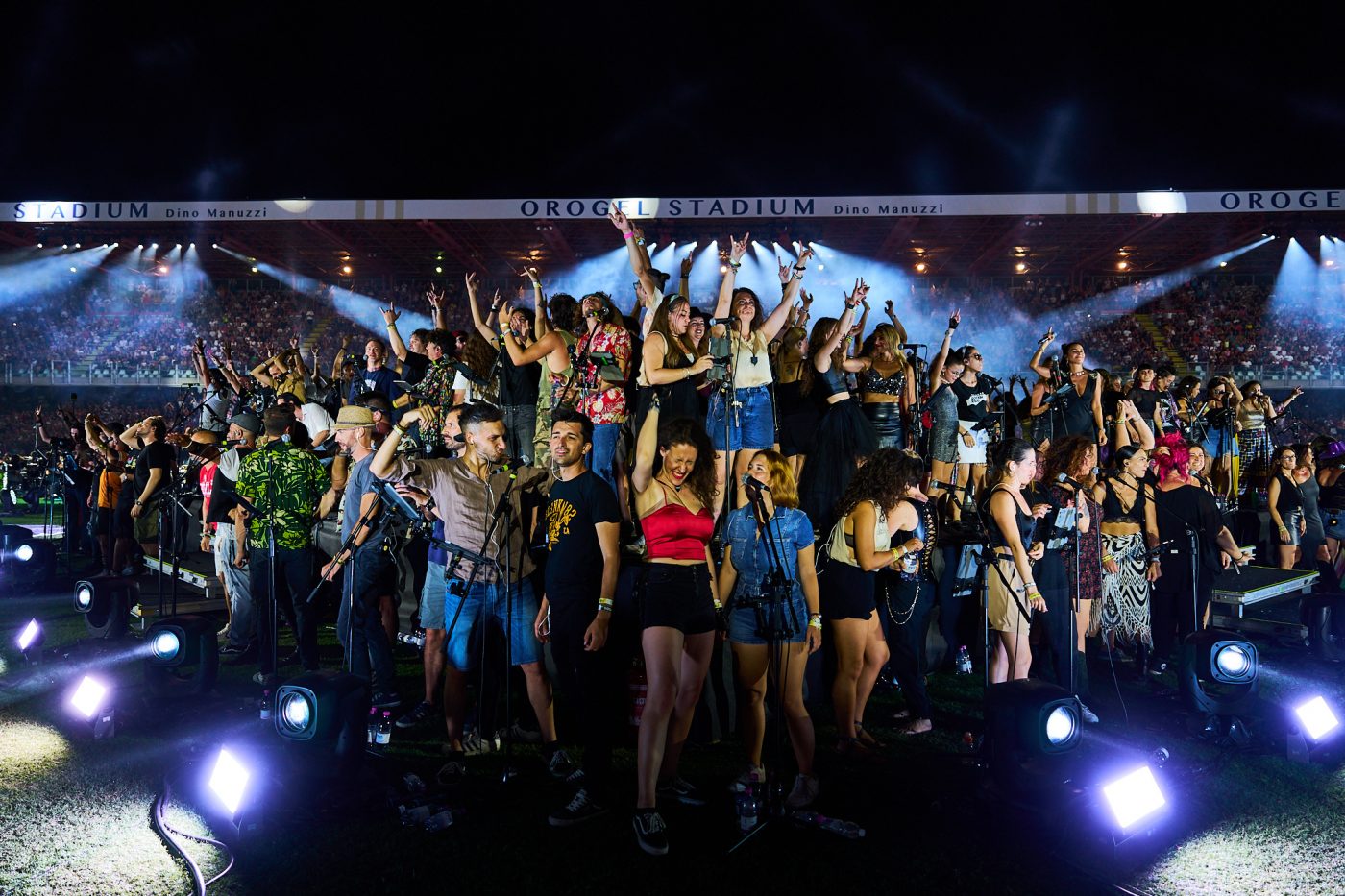 È così che l’energia emozionata dei mille sul prato diventa energia vibrante per tutti, combustibile che prende fuoco alla prima nota. Un campo magnetico che respira e batte al ritmo di migliaia di persone (20,000 sono quelle accorse ad assistere alla serata). “Una follia collettiva”, come l’ha definita Lodovica Comello alla conduzione dello speciale concerto solidale che, sabato 29 luglio, ha riportato la rock band più grande al mondo esattamente lì dove tutto era iniziato, a Cesena.