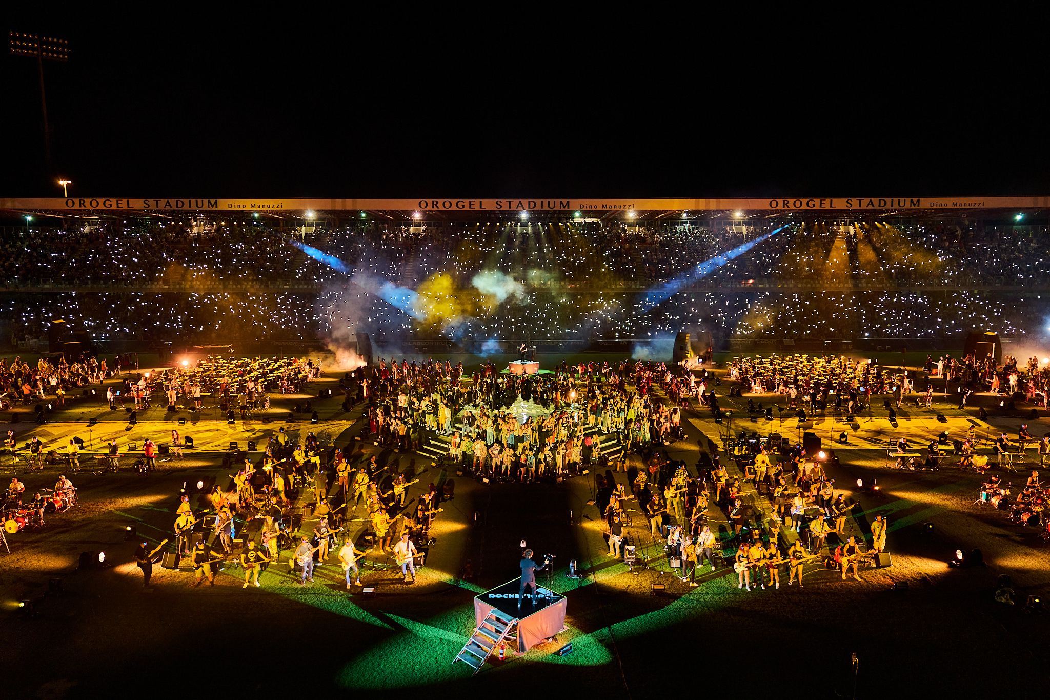 L’ingresso in campo dei mille musicisti, le luci che si abbassano, il volume che prorompe non prima di aver dedicato un minuto di silenzio alle vittime dell’alluvione dello scorso maggio. Se c’è una parola che può descrivere uno show unico come quello letteralmente messo in campo (stavolta all’Orogel Stadium Dino Manuzzi di Cesena) da Rockin’1000 è adrenalina. Quelle che ti prende allo stomaco a tradimento, dal minuto 0:00, quando ancora non te l’aspetti e che corre di fila in fila, facendosi percepire forte e chiara. Fisica.