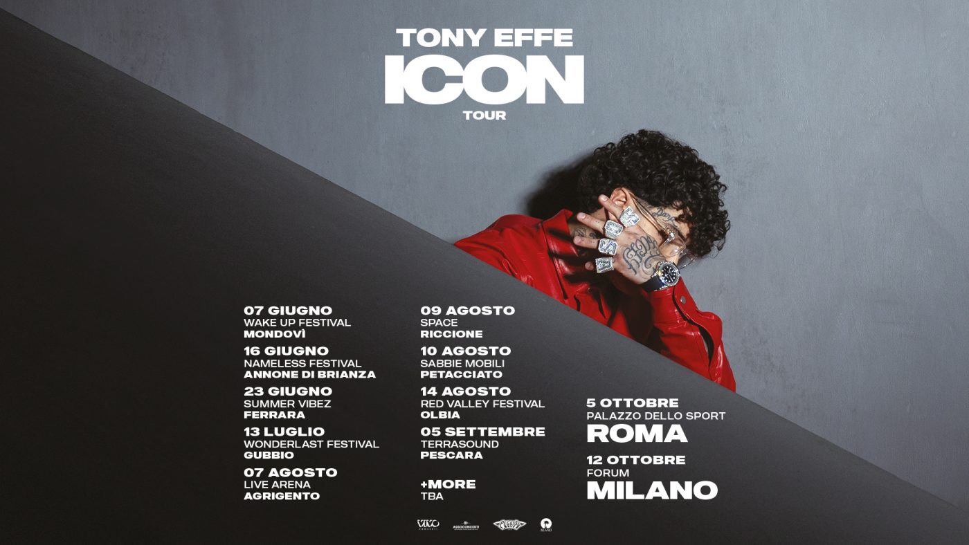 Ai vertici delle classifiche con il nuovo album ‘ICON’ (Disco d’Oro), Tony Effe annuncia il tour estivo che aggiunge nuovi appuntamenti live ai due speciali concerti nei palazzetti in calendario a ottobre (qui i dettagli). Prodotte da Vivo Concerti, le nove tappe nei festival italiani saranno l’occasione per presentare al pubblico le recenti hit il nuovo album da quattro settimane al primo posto nella Top of the Music FIMI/GfK.