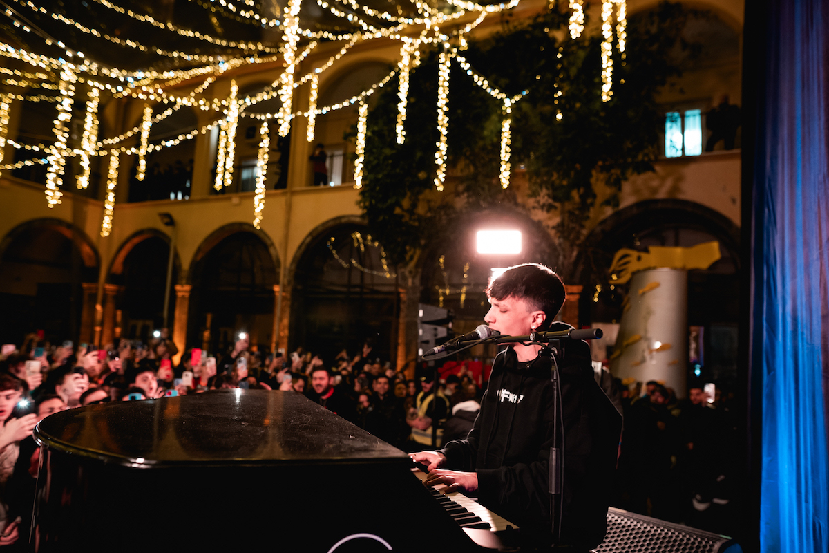 Niccolò sale sul palco della Corte del FOQUS introdotto dalle parole di Renato Quaglia, direttore della struttura: «Abbiamo raccontato a Ultimo che nei Quartieri Spagnoli l’illuminazione pubblica è arrivata molto tardi. Dato il suo legame speciale con Napoli, ha avuto piacere di regalare una sua performance a questo luogo regalando un’installazione che portasse simbolicamente la luce in questo luogo, e che resterà in dotazione al Foqus per accompagnare le feste».