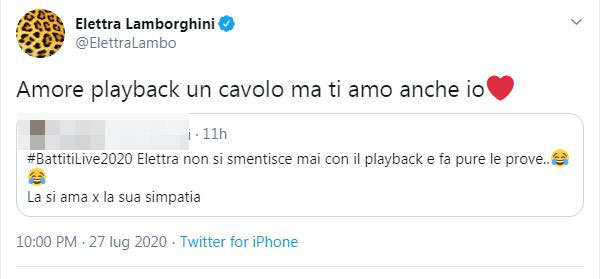 “Elettra non si smentisce mai con il playback e fa pure le prove… La si ama per la sua simpatia” ha scritto ironicamente un utente su Twitter. Immediata la reazione della cantante, che rivendica la sua performance dal vivo: “Amore playback un cavolo ma ti amo anche io”.