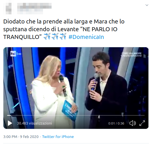 A Domenica In, dopo l’esibizione del vincitore del 70-esimo Festival di Sanremo, Mara Venier lo ha incalzato dicendo: “Una canzone d’amore, beh possiamo dirlo che sei stato fidanzato con Levante, no? Avete avuto una bellissima storia d’amore”. Diodato, visibilmente imbarazzato, ha provato a tergiversare, ma alla fine ha affermato che “Beh, sì, è anche per Levante”.
