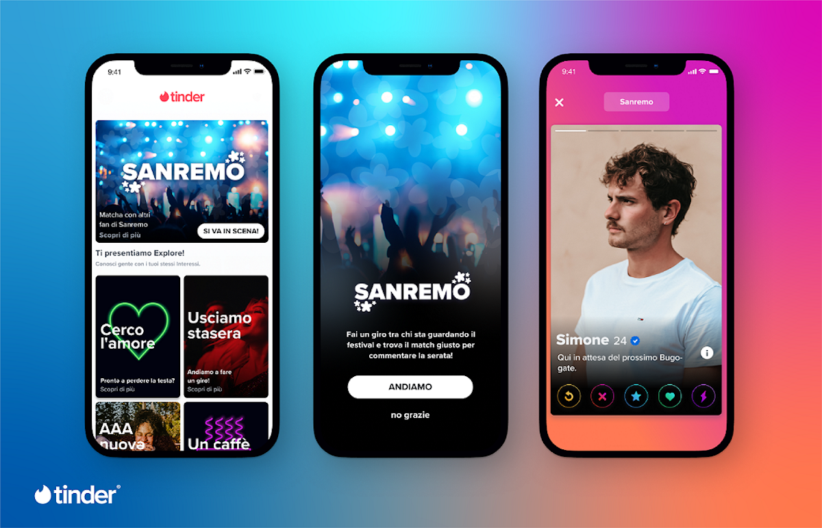 Inoltre, dal 5 al 12 febbraio, visita la sezione dedicata di Explore per conoscere altri fan di Sanremo, fangirlare insieme quando i vostri artisti preferiti salgono sul palco e commentare i momenti più divertenti dello spettacolo musicale. D’altronde, quale modo migliore di iniziare a conoscere meglio il tuo Match se non scoprendo la sua opinione sul più discusso topic del momento?!