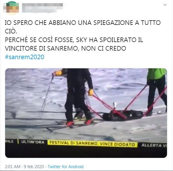 L’annuncio sul palco dell’Ariston è arrivato intorno alle 2.30, ma la notizia era stata spoilerata da Sky TG24 quasi un’ora prima. Che Diodato avesse vinto il 70esimo Festival di Sanremo ormai lo sapevano tutti, ma sul palco si continuava a tenere alta la suspense. Immotivatamente, visto che ormai anche sui social il pubblico ne era conoscenza. La vicenda ha mandato su tutte le furie i telespettatori ma anche i giornalisti delle altre testate che avevano promesso l’embargo fino al momento della proclamazione ufficiale.