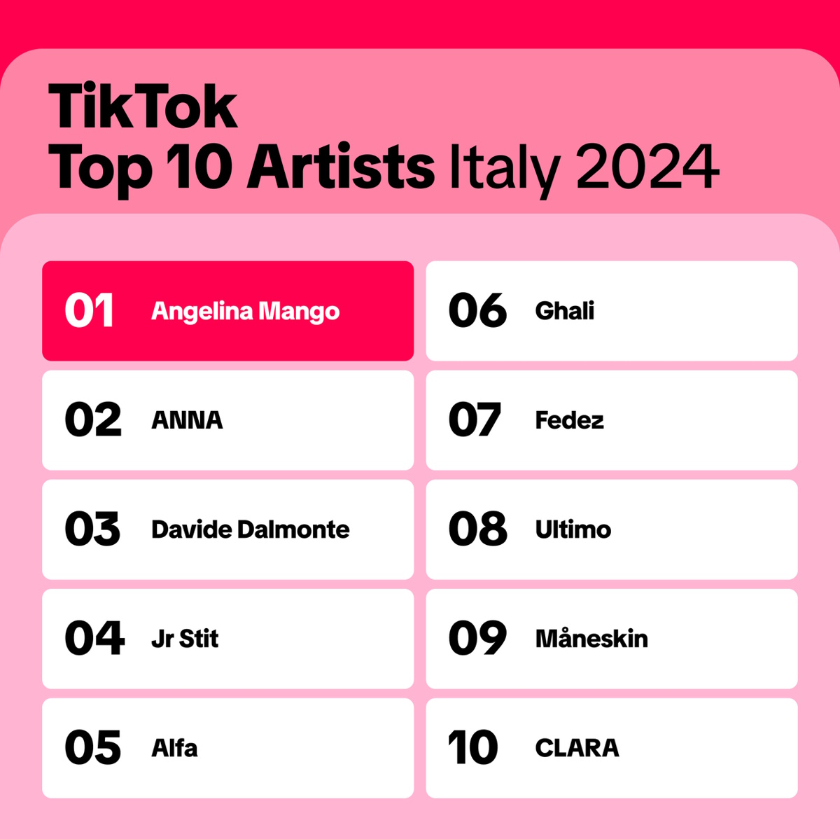 Tra i protagonisti assoluti di TikTok nel 2024 c’è Angelina Mango, al primo posto grazie alle sue performance live e ai vlog quotidiani che le fanno guadagnare il titolo di artista italiana più visualizzata.