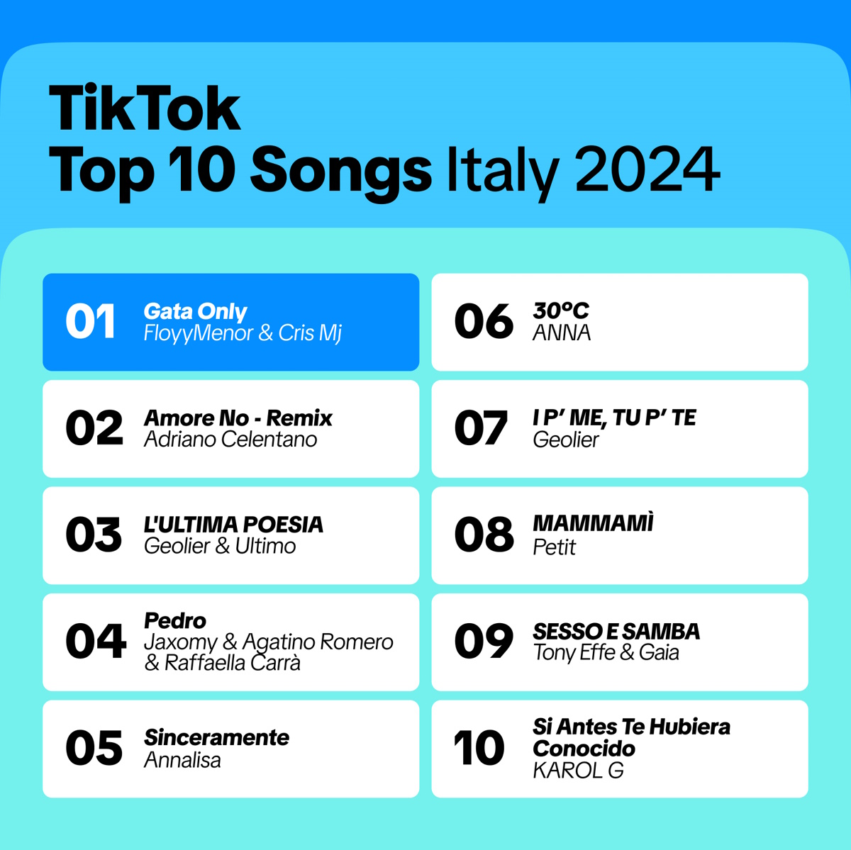 La canzone più amata su TikTok del 2024, sia in Italia che nel mondo, è stata Gata Only di FloyyMenor & Cris Mj. Dopo aver dominato l’estate come Song of the Summer, la hit reggaeton ha ispirato oltre 50 milioni di contenuti in app, scalando le classifiche globali.