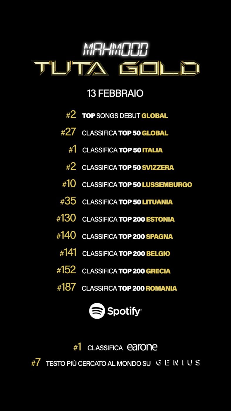 Dalla prima esibizione sul palco del Festival di Sanremo 2024, Mahmood non smette di macinare consensi negli ascolti. La sua Tuta gold continua, infatti, a scalare le classifiche conquistando il #1 posto nella Top 50 Italia di Spotify e il #2 posto della Top Songs Debut Global (9-11 febbraio). Con 2,553,282 riproduzioni, il brano si attesta alla 27esima posizione della Top 50 Global nella giornata di martedì 13 febbraio (dati relativi agli streams del 12 febbraio)