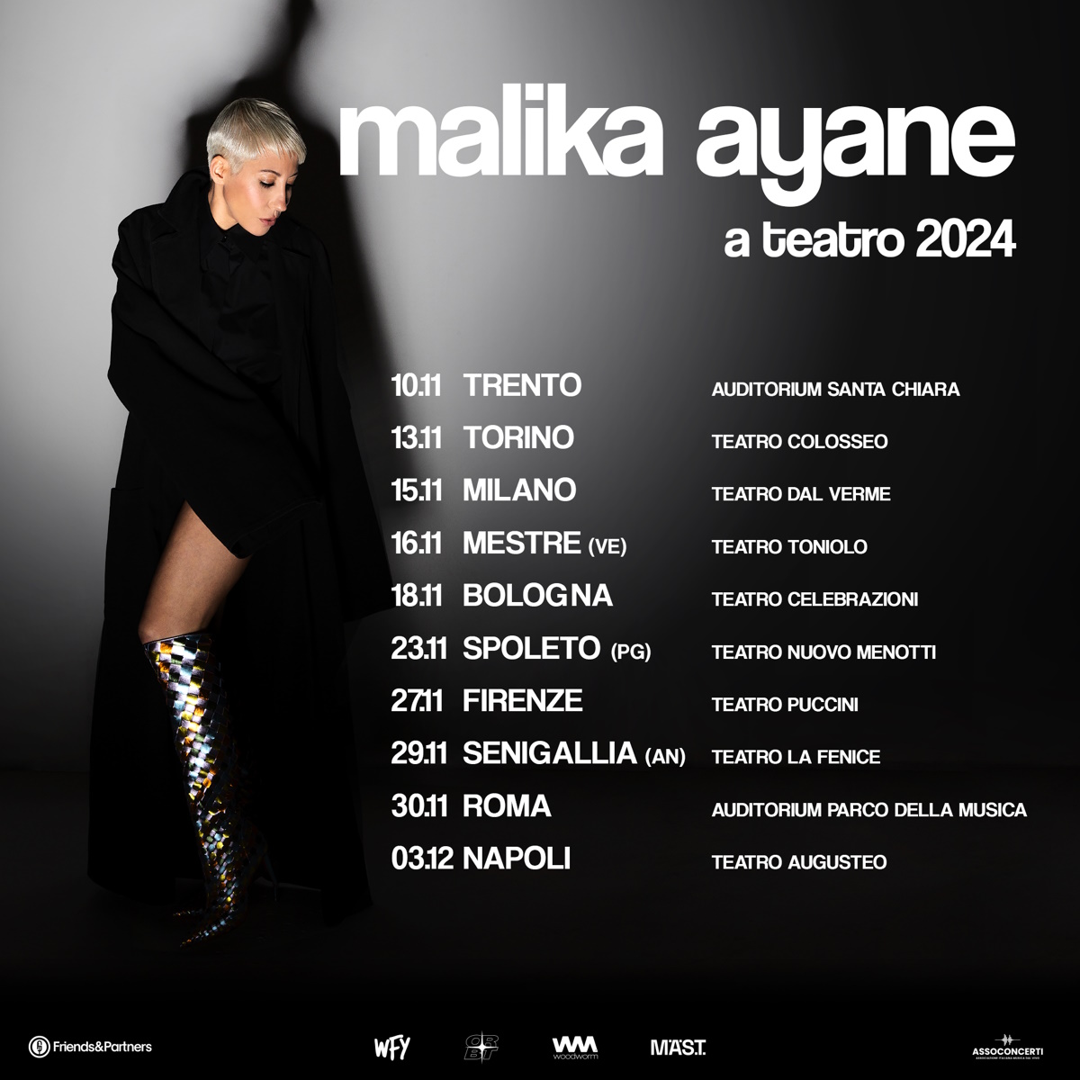 Questo autunno Malika Ayane si esibirà dal vivo con dieci appuntamenti nei teatri in un tour prodotto e organizzato da Friends&Partners. Ecco le date: