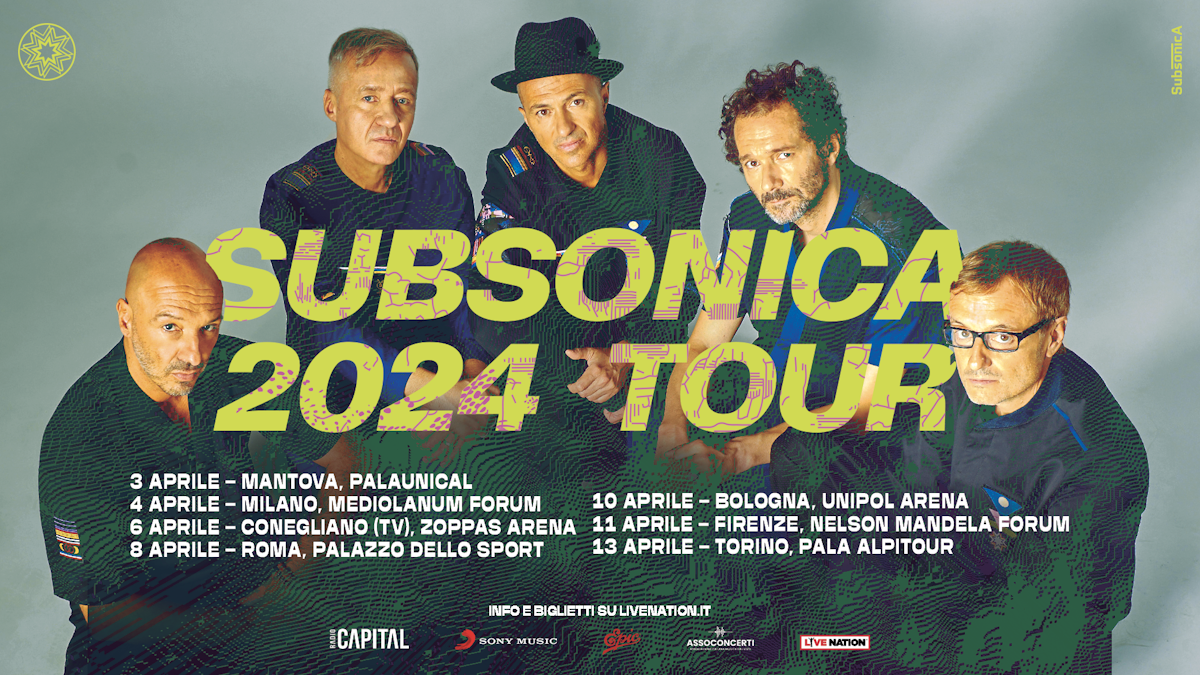 I Subsonica, una delle band più iconiche del panorama musicale italiano, hanno annunciato il ritorno live. SUBSONICA 2024 TOUR sarà, infatti, la tournée che porterà il gruppo a suonare in alcuni dei principali palazzetti italiani a partire da aprile 2024. Una dimensione, quella dal vivo, che per i Subsonica raccontano di vivere oggi come ieri. “Come momento di fortissima connessione tra di noi e tra noi e il resto delle persone – raccontano – che, seguendoci, scelgono di fare parte di una storia che continua a essere scritta su ogni palco, ad ogni singolo e irripetibile concerto”.