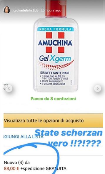 Come già fatto notare da molte altre persone sul web, l’Amuchina ha raggiunto prezzi stellari su Amazon e anche la De Lellis ha voluto sottolineare di essere “scioccata”: come tutti in questi giorni avrebbe voluto farne scorta ma non è riuscita a trovarne da nessuna parte.