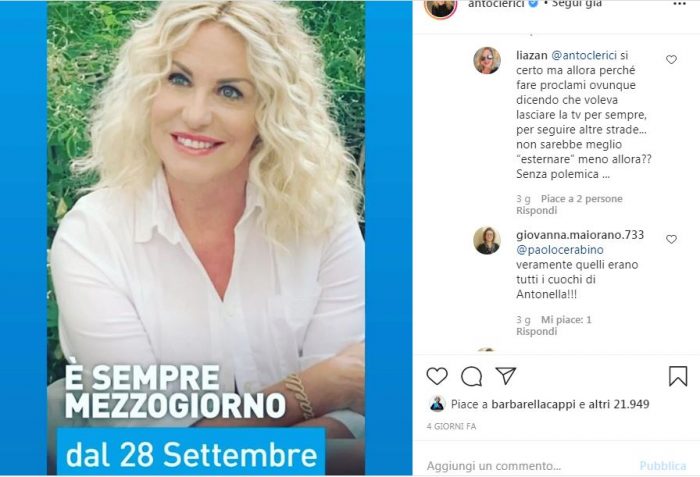 “Ho sempre amato Antonella Clerici, sono contentissimo del suo rientro. Il suo show partirà il 28 settembre da Milano, la struttura scenica è complicata ed è per questo che nel rispetto delle misure anti Covid abbiamo deciso di partire il 28″, queste le parole di Coletta, che sgombrano il campo da qualunque sospetto di problemi di altra natura dietro il rinvio.