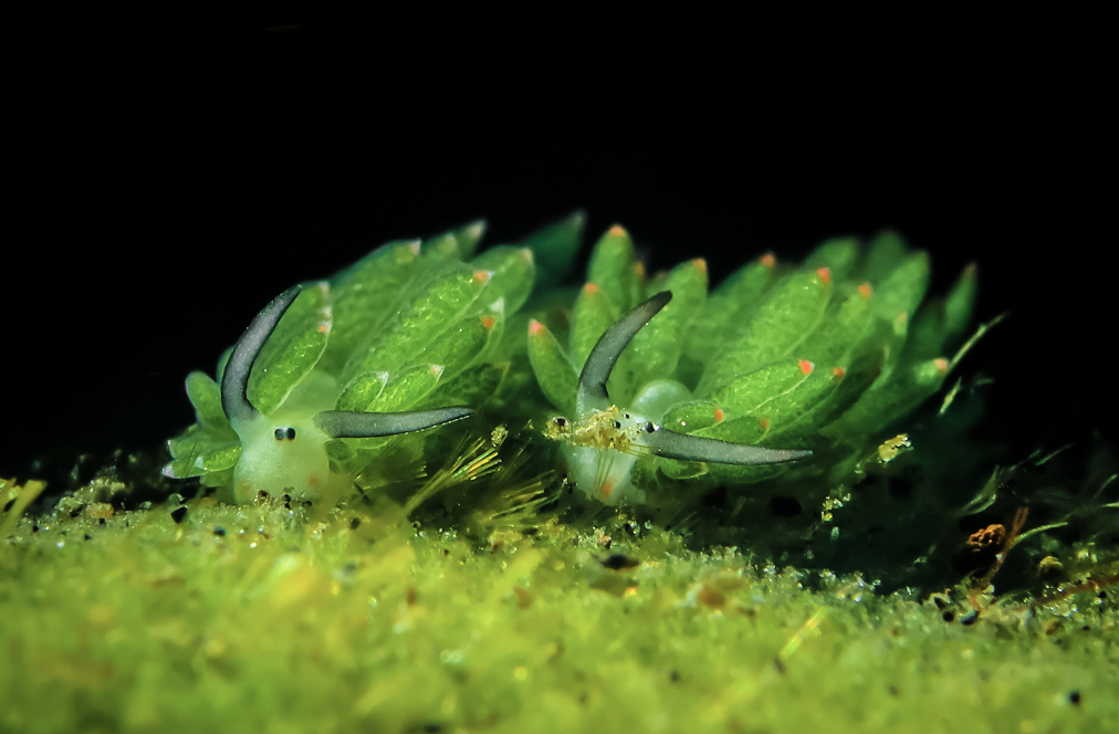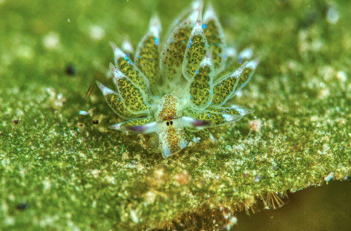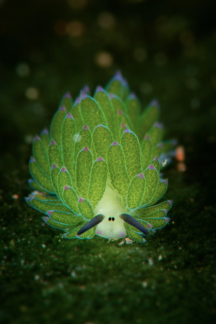 È un invertebrato con piccoli occhi neri e antenne che sembrano orecchie. Questo strano animale subisce la fotosintesi, attraverso i cloroplasti che assume mangiando l’alga.
