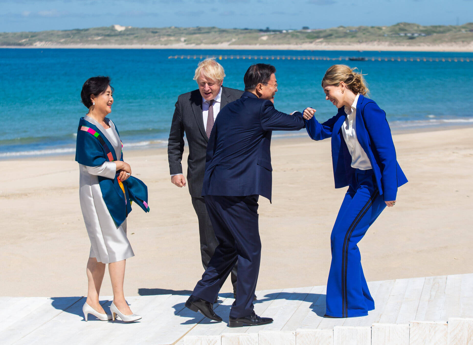 Sulla spiaggia di Carbis Bay, i leader presenti erano quelli dei paesi del G7 (Stati Uniti, Canada, Regno Unito, Francia, Germania, Italia, Giappone) ovvero Joe Biden, Justin Trudeau, Boris Johnson, Emmanuel Macron, Angela Merkel, Mario Draghi e Yoshihide Suga.