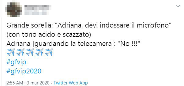 A tarda notte, Adriana è in cucina e dalla regia una voce femminile con tono fermo e deciso le ricorda di indossare il microfono. Lei replica con un secco: “No!”.