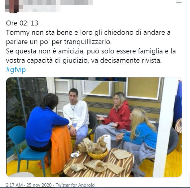 Tommy è apparso fragile, quasi indifeso. Timoroso di non riuscire a resistere nella casa di Cinecittà senza i suoi legami più stretti. Maria Teresa Ruta, altra sua grande amica, lo ha rassicurato: “Io per te resto, non ti mollo, finché ci sei tu rimango”. Una consolazione che non basta però a rasserenare gli animi. Zorzi ha bisogno di chiarirsi con Francesco e Stefania. E lo fa nella notte.