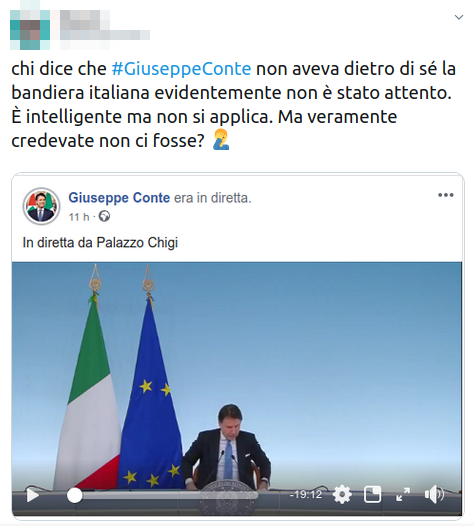 In realtà, però, quella di Giuseppe Conte durante il suo discorso non è affatto una gaffe, come ha notato qualcuno un po’ più attento: la bandiera italiana era esattamente dove doveva essere ma l’inquadratura stretta la tagliava fuori.