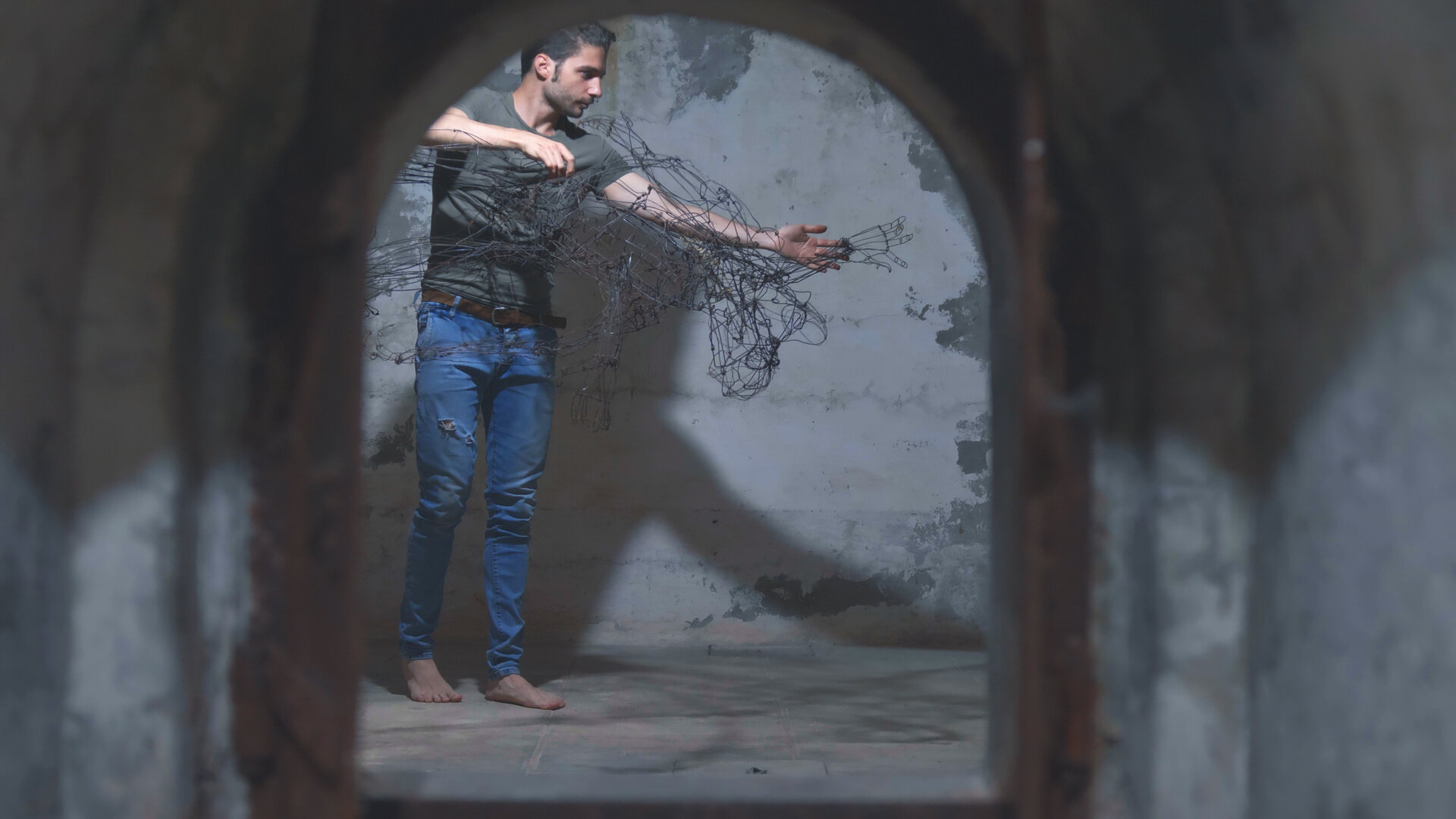 Il fil di ferro è la materia dell’arte di Pinosio, il mezzo espressivo di una ricerca che dura da anni e che cammina in parallelo con i suoi studi di canto: a spiegare questo binomio inusuale e suggestivo è lo stesso artista, che ci racconta come il filo di metallo gli permetta di creare dei vuoti all’interno del corpo, vuoti in cui abita la voce.