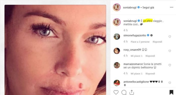 Sonia infatti scrive: “E’ un’altro viaggio, mettila così…” (citazione da un brano di Tiziano Ferro) e subito scatta la gara fra gli utenti a farle notare che l’apostrofo è sbagliato. Critiche feroci e insulti neanche tanto velati quindi si moltiplicano, misti anche a complimenti di utenti che l’errore non l’hanno notato o hanno deciso di soprassedere.