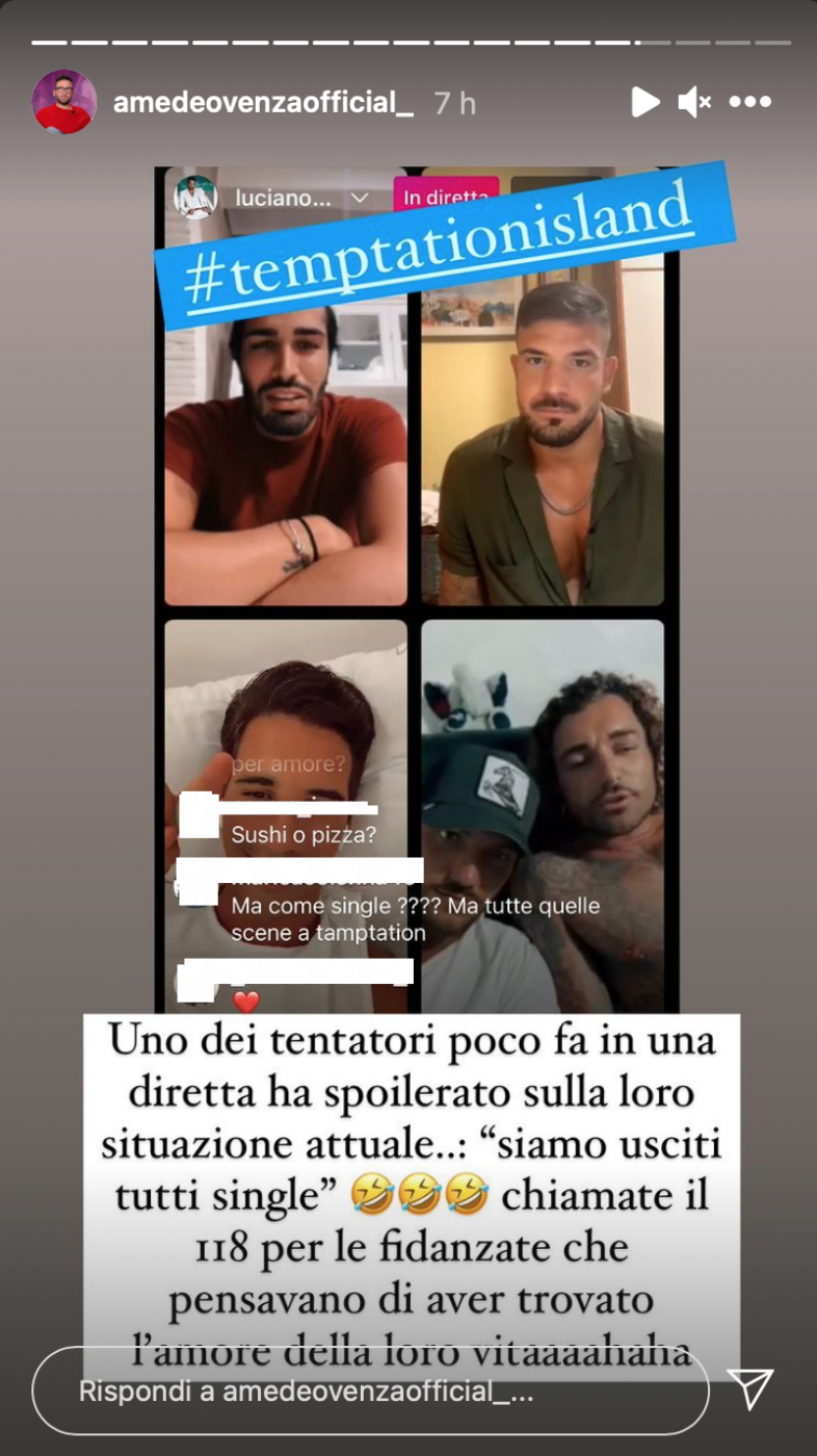Ma a far discutere sono proprio le rivelazioni fatte dai tentatori durante una diretta su Instagram. Se durante la puntata di Lunedì infatti, Davide aveva consolato Jessica dicendole anche “Sei fortissima e io ci sono ok?” e le aveva confermato che si sarebbero visti fuori.. nella diretta uno dei tentatori ha detto “siamo usciti tutti single”.