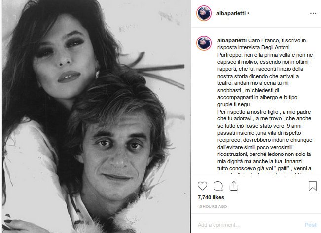 È per questo che, pubblicando un’immagine che la ritrae proprio insieme a lui, la celebre opinionista ci ha tenuto a dire la sua su Instagram: “Caro Franco, purtroppo non è la prima volta e non ne capisco il motivo, essendo noi in ottimi rapporti, che tu racconti l’inizio della nostra storia dicendo che arrivai a teatro, andammo a cena tu mi snobbasti, mi chiedesti di accompagnarti in albergo e io tipo grupie ti seguii […] Bisognerebbe evitare simili poco verosimili ricostruzioni, perché ledono non solo la mia dignità ma anche la tua.”