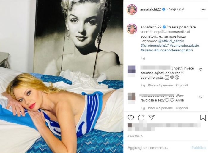 Notti agitate invece per i suoi ammiratori, che non contengono l’entusiasmo di fronte alle sue pose sexy. Come quella che ha sfoggiato qualche settimana fa, esultato ancora una volta per la vittoria della Lazio. Anna Falchi si era mostrata su Instagram con la schiena nuda, senza reggiseno, con il pantaloncino della divisa della squadra e la sciarpa sul letto.