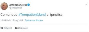 Tra i telespettatori di del reality estivo per eccellenza di Canale 5, spunta anche una insospettabile Antonella Clerici che, nel corso dell’ultima puntata andata in onda lunedì 15 luglio, ha cinguettato su Twitter esprimendo apprezzamento per il programma.