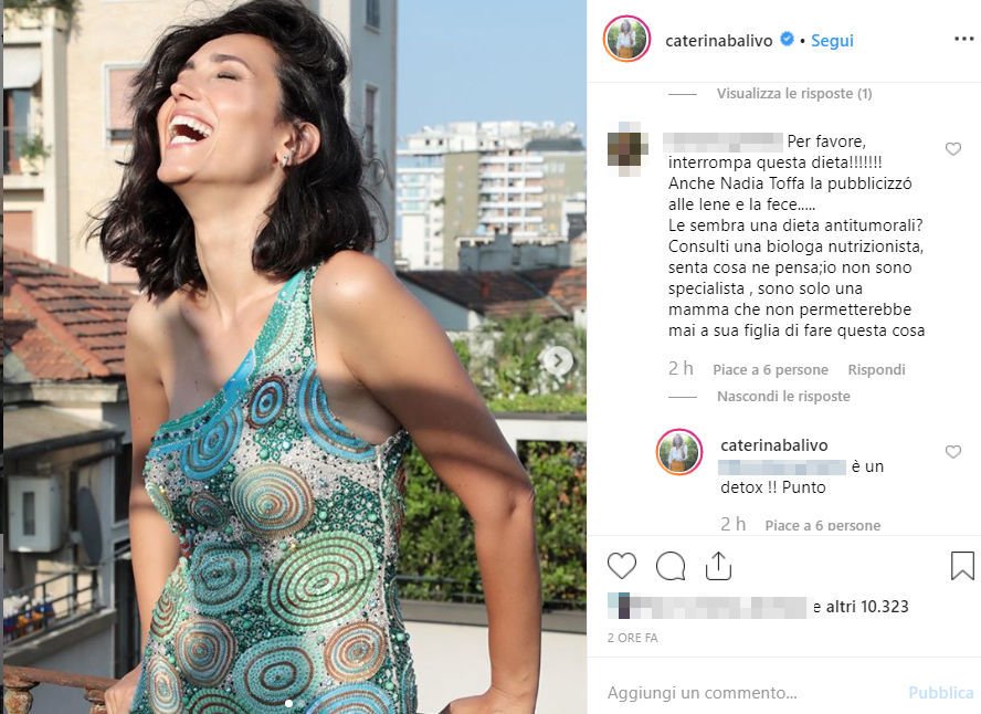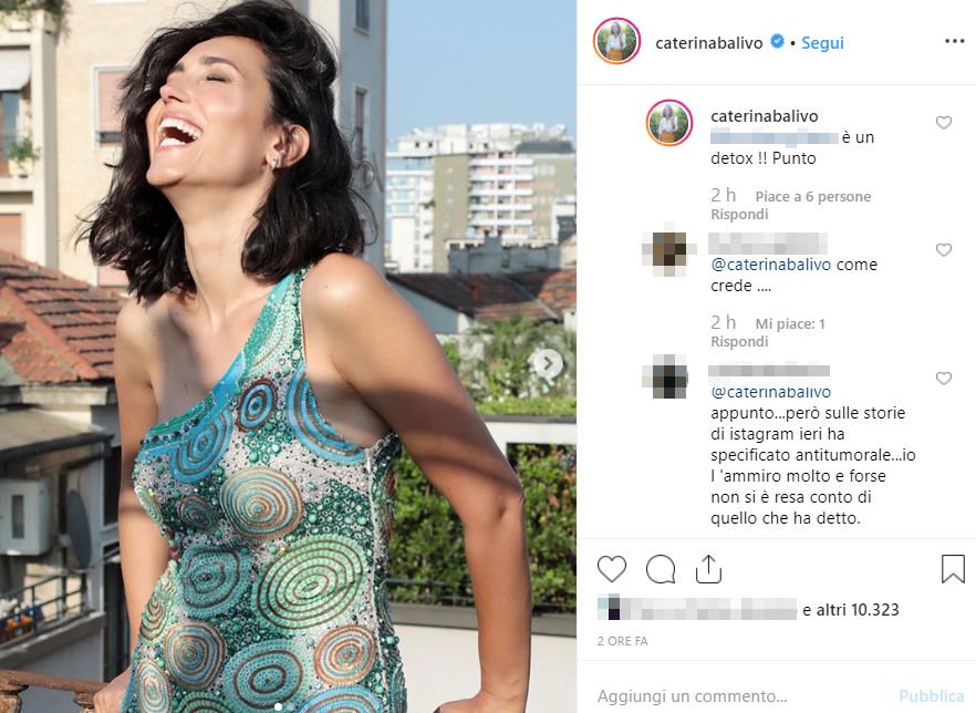 La risposta di Caterina è stata semplice: “è un detox, punto”. Al che un’altra fan le fa notare che: “appunto…però sulle storie di Instagram ieri ha specificato antitumorale…io l ‘ammiro molto e forse non si è resa conto di quello che ha detto”.