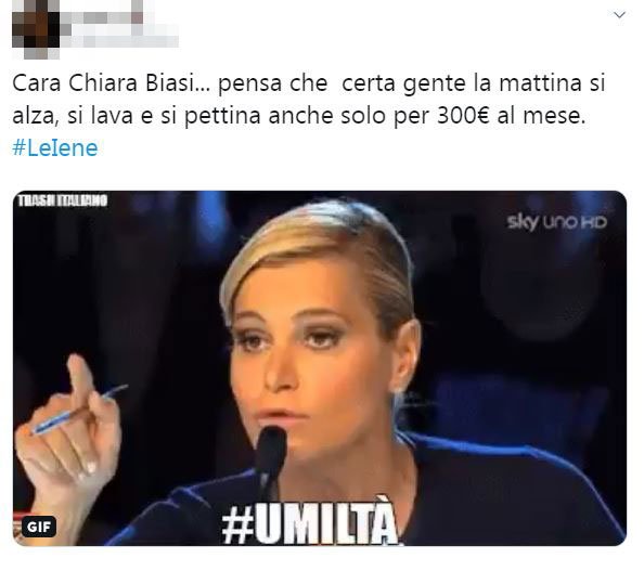 “E niente, non so cosa dire. Frasi così banali del tipo che ci siamo fatti il mazzo per cosa? Con anni di studio e sacrifici al massimo ti danno un tirocinio dove ti sfruttano per 600 euro. Chiara Biasi senza arte né parte rifiuta 80.000 euro. Ebbene così” twitta amaramente qualcun altro.