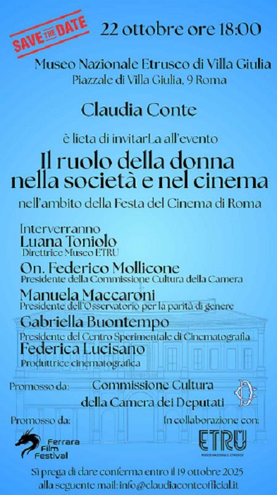 Per fortuna, a qualcuno ogni tanto viene un’idea. È stato questo il nostro primo pensiero, ripensando a quel bisogno di dialogo che la realtà di tutti i giorni ci detta. E così, nei giorni della Festa del cinema di Roma, il Museo nazionale Etrusco di Villa Giulia ha ospitato un evento speciale ideato da Claudia Conte, giornalista, scrittrice e imprenditrice culturale, promosso da Ferrara Film Festival e dalla commissione Cultura della Camera dei deputati. Una bella riflessione collettiva, che ha cercato di porre in evidenza il contributo storico delle donne nella società italiana di oggi e nel panorama cinematografico, promuovendo un dialogo aperto su parità, rappresentazione e inclusione. Il confronto è stato moderato dalla stessa Claudia Conte, da sempre attivista nella promozione del talento delle donne e condirettrice artistica del Ferrara Film Festival. All’incontro hanno partecipato: Luana Toniolo, direttrice del Museo nazionale Etrusco; Manuela Maccaroni, presidente dell’Osservatorio per la Parità di genere presso il Ministero della Cultura; Gabriella Buontempo, presidente del Centro sperimentale di cinematografia; Federica Lucisano, produttrice cinematografica. Al termine, si è tenuta una breve cerimonia di premiazione di alcune importanti figure, come la nostra rappresentativa nazionale di calcio femminile; il regista e sceneggiatore Gabriele Pignotta, premiato dalla Fondazione ‘Francesca Rava’, che ha celebrato i suoi 25 anni di impegno accanto ai bambini in difficoltà; la cantante e atleta Annalisa Minetti, simbolo autentico di determinazione nel superamento di barriere di tutti i tipi; Denny Mendez, ex Miss Italia e attrice impegnata nella lotta contro la violenza di genere. A margine della serata, abbiamo rivolto alcune domande alla collega Claudia Conte, al fine di comprendere le motivazioni di quest’iniziativa.