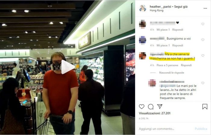 “Ho visto un reportage sulla RAI e mostrava immagini della Cina ovviamente (ma non ricordo la città) e di come si cerca di limitare la diffusione del virus… Le persone erano coperte dalla testa ai piedi, avevano persino i guanti… Nel tuo video vedo che ad Hong Kong è molto più soft” osserva un utente napoletano.