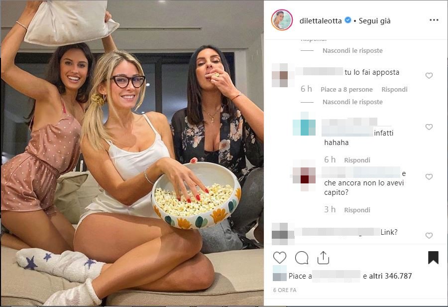Nel post, dunque, le tre si mostrano nel classico atteggiamento di teen-ager nei pigiama party, con tanto di riferimenti ai pop-corn e alla lotta di cuscini. Tuttavia, le loro pose – soprattutto quella di Diletta – sono decisamente hot.