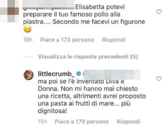 In particolare, l’utente scrive: “Elisabetta, potevi preparare il tuo famoso pollo alla piastra… Secondo me facevi un figurone”. Rivelatoria la replica della Canalis: “Ma poi se l’è inventato Diva e Donna. Non mi hanno mai chiesto una ricetta altrimenti avrei proposto una pasta ai frutti di mare… più dignitosa!”.