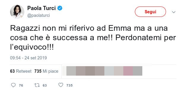 “Ragazzi – ha scritto su Twitter – non mi riferivo ad Emma ma a una cosa che è successa a me!! Perdonatemi per l’equivoco!!!”