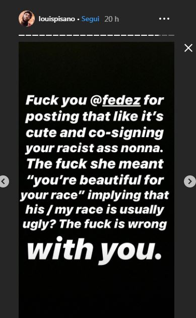 “Vaff****lo Fedez per aver postato questo video spacciandolo per tenero e che appoggi la tua nonna razzista del cavolo. Con la frase ‘Sei bello per la tua razza’ lei voleva intendere che solitamente la sua/mia razza è brutta? Ma che ca**o di problemi avete?!” ha sbottato.