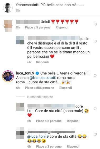“Che bella l’Arena di Verona!!! Ahahaha. Roma Roma Roma, cuore de sta città…” scrive Luca citando a sua volta una canzone. Si tratta del brano di Antonello Venditti divenuto inno della squadra giallorossa, del quale però sbaglia una parola. L’ex calciatore scrive infatti “cuore” al posto di “core”, scatenando ilarità tra gli utenti, che sono corsi a correggerlo.