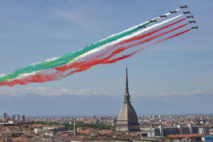 In un momento storico in cui si accusano assembramenti di giovani fuori dai locali e, a volte, di bambini ai parchetti, ha destato molta attenzione la folla, seppur composta, che ha assistito in strada nelle città italiane alla parata aerea delle frecce tricolori. In particolare a Torino.