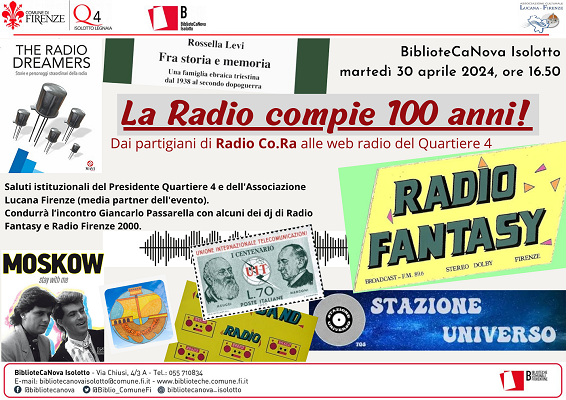Dalle 16,50 alle 19,00 la BiblioteCaNova Isolotto si trasforma in un luogo di studio e memoria, il tutto in collaborazione con il Quartiere 4 e l’Associazione Lucana Firenze. Coordina e presenta Giancarlo Passarella, anche per il suo passaggio dall’emittenza privata a Rai Radio Uno nel 1986/87, trasmettendo sia da Via Asiago 10 a Roma ma anche dalla sede regionale toscana. Aprile e Maggio sono anche mesi simbolici per ricordare Radio Co.Ra, perché furono gli ultimi nel 1944 in cui ha trasmesso per mettere in contatto gli Alleati e la resistenza partigiana a Firenze: ma quel seme di libertà ha germogliato, portando alla bella stagione delle radio libere ed il Quartiere 4 ha sempre assunto il ruolo di accoglienza con l’indimenticabile Radio Fantasy (in via Coppo di Marcovaldo). L’attualità delle radio è anche fucina di modernità, basti pensare all’emittente web Stazione Universo (in via dell’Argingrosso) ed all’esperienza didattica di Radio NaveTonda, la web radio presso la scuola alla Montagnola, con l’impegno tra l’altro di Beatrice Barbieri, insegnante e presidente della Commissione Cultura del Quartiere 4…
