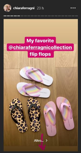 Tutto è iniziato con le IG Stories in cui Chiara Ferragni ha pubblicizzato le nuove infradito per l’estate 2020. Sull’immagine, il link per accedere allo shopping online del suo sito.