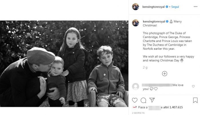 Lo scatto è di una dolcezza infinita e mostra il primogenito di Carlo e Diana insieme ai principini George, Charlotte e Louis. William sta baciando sulla guancia il più piccolo dei tre figli, mentre gli altri due guardano nell’obiettivo.
