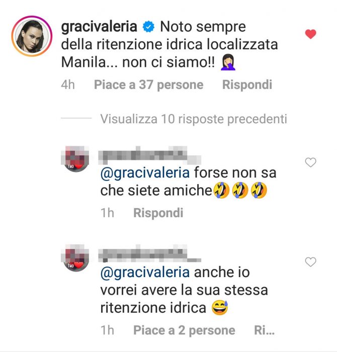 Tra i commenti non sono mancati gli apprezzamenti per il suo corpo statuario, che rasenta la perfezione. Ma a un certo punto ne è comparso uno che ha creato qualche incomprensione: “Noto sempre della ritenzione idrica localizzata Manila… non ci siamo!!”. A scriverlo è Valeria Graci, nota attrice comica e amica di Manila.