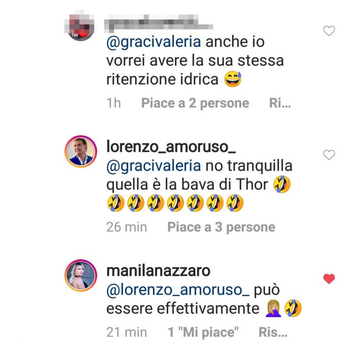 Così, sotto al commento di Valeria, c’è chi le fa notare che non è vero, che Manila Nazzaro non ha la ritenzione idrica. E non manca di osservare che “l’invidia è una brutta bestia”. Molti altri fan dell’ex reginetta di bellezza sono dovuti intervenire per spiegare che si trattava di una battuta. “Anche io vorrei avere la sua stessa ritenzione idrica” aggiunge qualcuno con altrettanta ironia.