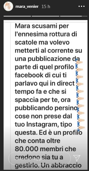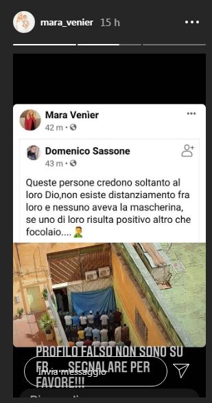 Così Mara Venier ha riportato nelle sue storie di Instagram due profili Facebook che le sono stati segnalati, tutti e due falsi, chiedendo ai suoi follower di aiutarla a farli chiudere. In una storia ha riportato anche un contenuto che la falsa Mara Venier aveva ripostato, in modo da rendere chiaro che niente di tutto ciò proveniva da lei.