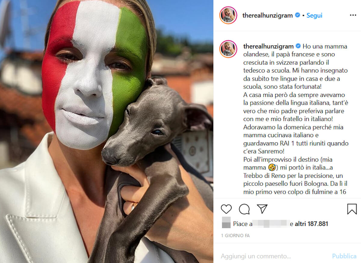 Infine, chiude con una meravigliosa dedica: “Sono l’unica svizzera che ha fatto il “pieno” in Italia e sono fiera di essere a tutti gli effetti una cittadina italiana. L’Italia la vedo ancora oggi con gli occhi innamorati di una straniera apprezzandone tutte le sue meraviglie, ma il mio cuore e nei sogni ormai parlo da tanti anni l’italiano. Buona festa della repubblica amore mio e paese del nostro cuore!! Evviva l’Italia”.